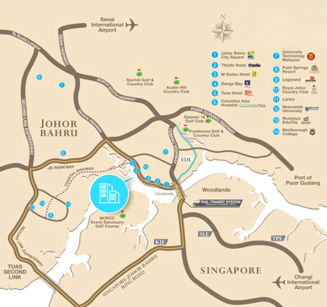 It’s located just about 5–7 km from the Johor Bahru Customs, Immigration and Quarantine Complex (CIQ) checkpoint, with good connectivity to Singapore.